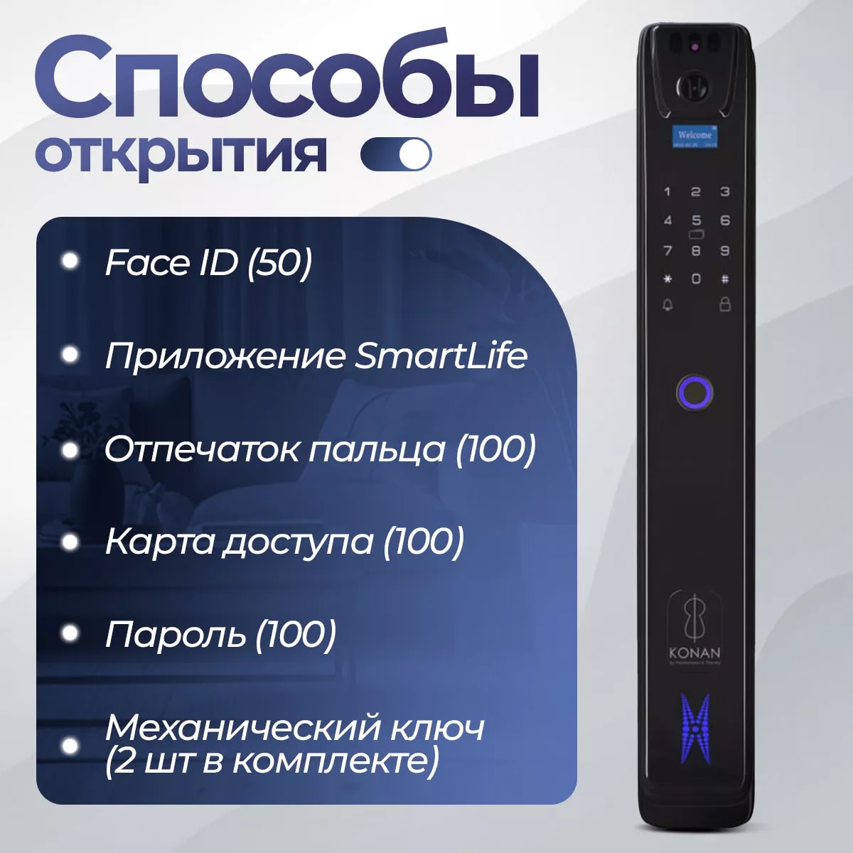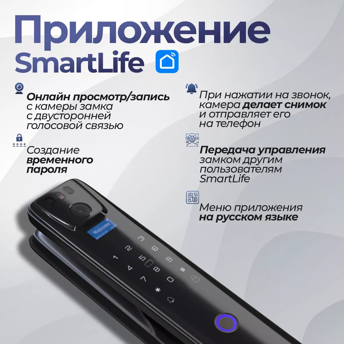 В арсенале замка присутствует возможность открыть доступ с помощью введения персонального цифрового кода, приложив карту доступа или палец в специальную зону, а также воспользовавшись приложением для смартфона TUYA SmartLife.